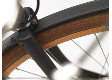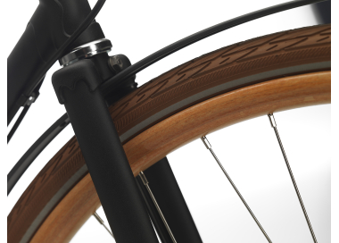 In addition to the wooden rims, the Sam features an exceptionally refined finish: unique low-profile fenders, a golden chain, and a leather saddle and hand grips produced by Brooks.